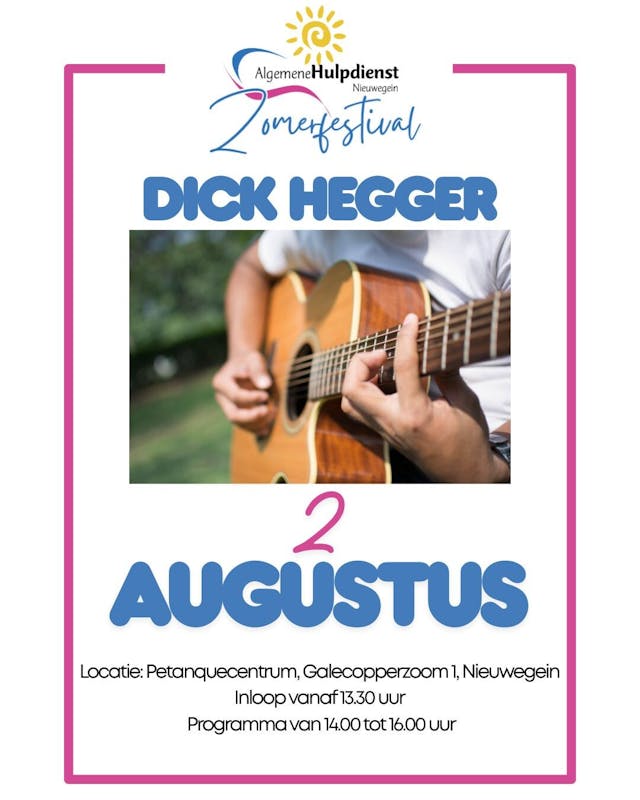 Op zaterdag 2 augustus komt onze eigen vrijwilliger Dick Hegger optreden tijdens het AHN Zomerfestival! Met zijn gitaar en fijne stem zingt hij bekende liedjes waar je vrolijk van wordt.
