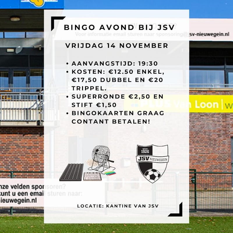Op deze vrijdagavond is er een bingo bij JSV-Nieuwegein. Aanmelden is niet nodig, dus kom vooral gezellig langs. Aanvang is 1930 en de bingokaarten dienen contant afgerekend te worden. Er zijn mooie geldprijzen en pakketten te winnen.