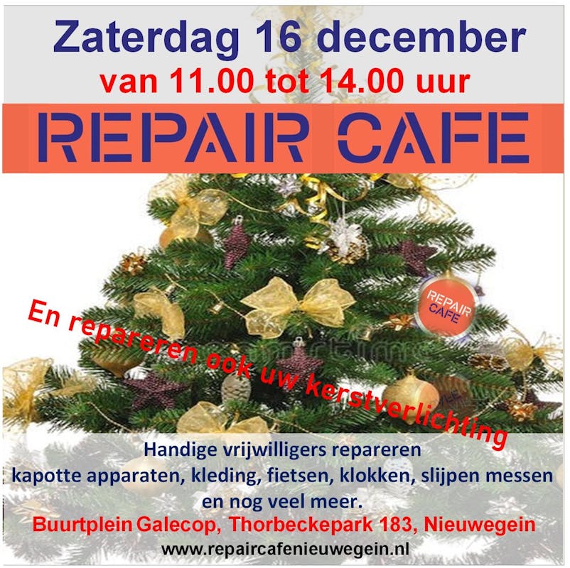 Het Repair Café Nieuwegein – Locatie Galecop vindt plaats op Buurtplein Galecop, Thorbeckepark 183, Nieuwegein. Het Repair Café Nieuwegein – Locatie Galecop is op zaterdag 16 december van 11-14 uur. Afhankelijk van de drukte stopt het aannemen van reparaties dus bezoekers kunnen het beste tijdig komen. In verband met het opbouwen stellen wij het op prijs dat u pas vanaf 10.30 uur in de wachtrij plaatsneemt.
