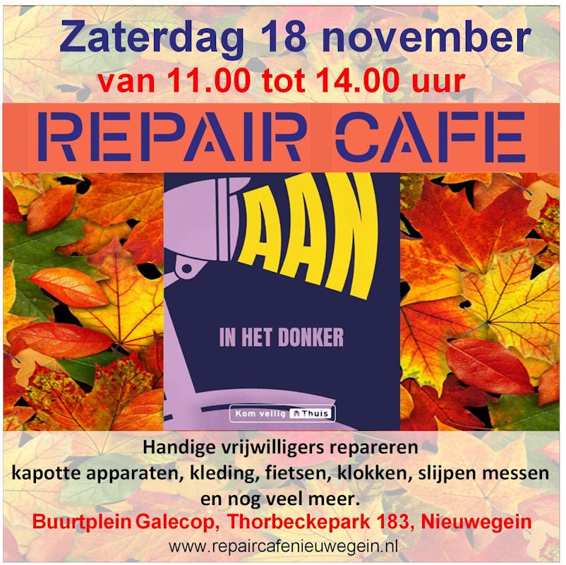 Het Repair Café Nieuwegein – Locatie Galecop vindt plaats op Buurtplein Galecop, Thorbeckepark 183, Nieuwegein. Het Repair Café Nieuwegein – Locatie Galecop is op zaterdag 18 november van 11-14 uur. Afhankelijk van de drukte stopt het aannemen van reparaties dus bezoekers kunnen het beste tijdig komen.