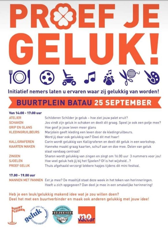 Kom je ook? op Buurtplein Batau houden we een minifestival van Nieuwegein Noord. Ook Buurtplein Galecop zal vertegenwoordigd zijn. Zo zal Ans van der Wal aanwezig zijn om koersbal te laten zien en de gehele brei en haakclub is aanwezig. evenals de welzijnscoach, vanuit buurtplein Batau zullen er ook diverse initiatieven plaatsvinden, ook kun je een workshop Salsa dansen volgen.