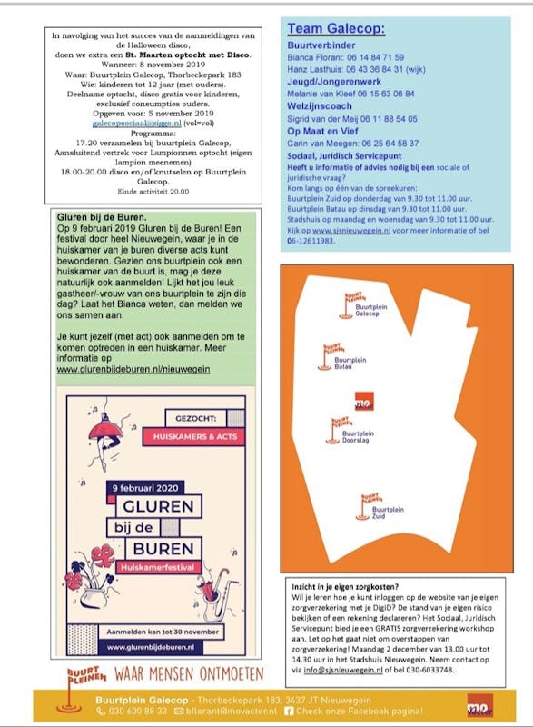 De tijd vliegt, het is alweer november. De blaadjes vallen van de bomen. Wintertijd is in gegaan en ook aan het weer merken we dat het kouder word. Met de donkere avonden komen de feestdagen ook weer dichterbij, wil jij in deze periode iets doen op het buurtplein neem dan contact met de buurtverbinder van Buurtplein Galecop op.