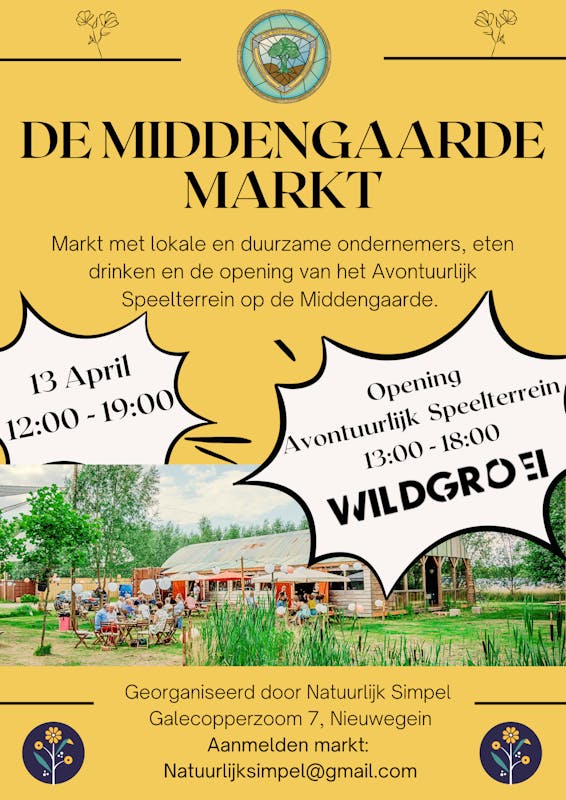 Op 13 april vindt de allereerste Middengaardemarkt plaats in Galecop. Een markt met leuke lokale ondernemers. Tegelijkertijd is ook de opening van het Avontuurlijk Speelterrein. Dus neem je kinderen mee, laat ze lekker vies worden, geniet van de markt, een hapje en een drankje.