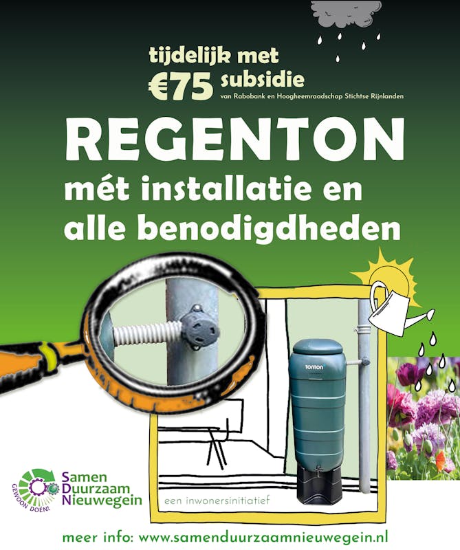 De eerste 100 mensen uit Nieuwegein die een regenton bestellen bij Samen Duurzaam Nieuwegein krijgen een korting van €75. Dus wees er snel bij!