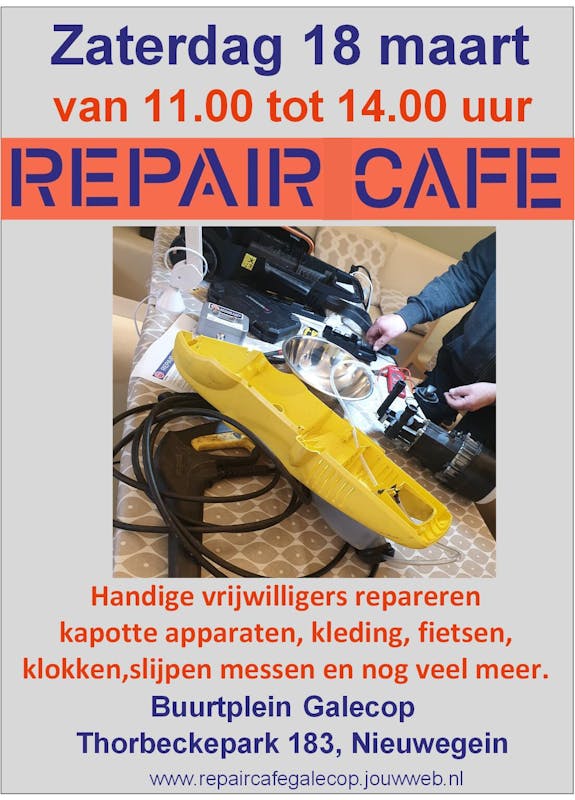 Het Repair Café Galecop vindt plaats op Buurtplein Galecop, Thorbeckepark 183, Nieuwegein. Het Café is op zaterdag 18 maart 2023 van 11-14 uur. Het tijdstip waarop de inloop sluit, is afhankelijk van het aantal aangeboden reparaties.