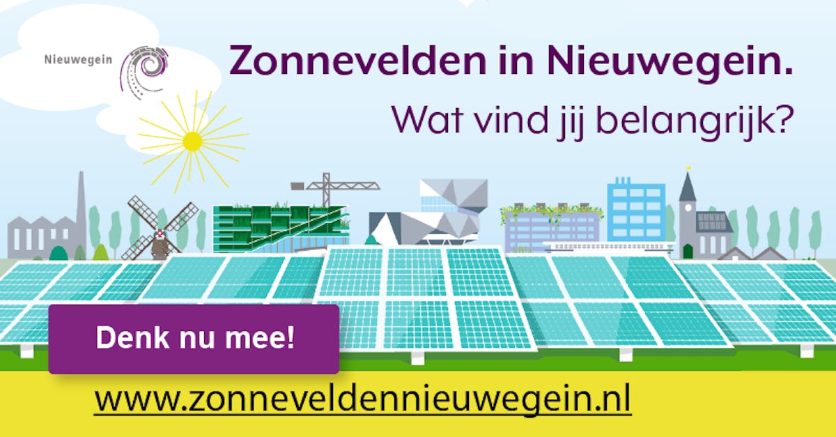 Wat vindt u belangrijk bij de aanleg van zonnevelden? Waar moeten locaties en zonnevelden in onze gemeente aan voldoen? Laat het weten via www.zonneveldennieuwegein.nl