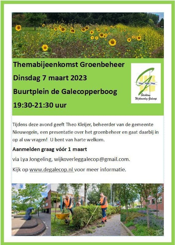 Kom je ook naar de thema avond Groen van het wijkoverleg Galecop op dinsdag avond 7 maart 2023?