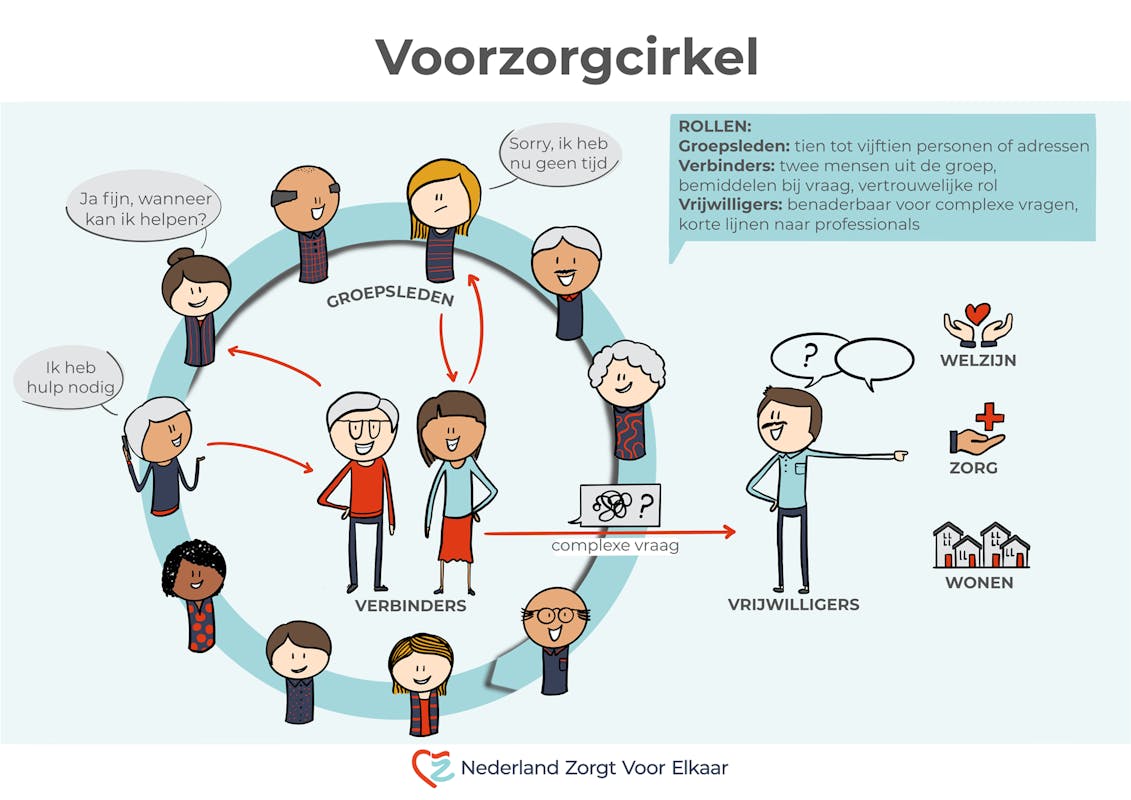 De ‘zorg’ in het woord voorzorgcirkel moet je zien als ‘omkijken naar elkaar’, en niet als professionele zorg. Het gaat om zorgzaamheid, ondersteuning, hulp, gezelligheid en het tegengaan van eenzaamheid. Voorzorgcirkels worden - het woord zegt het al - uit voorzorg gevormd.